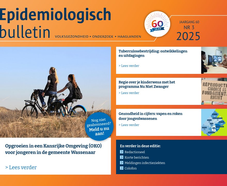 In deze editie: JAARGANG 60 NR 3 2025 Opgroeien in een Kansrijke Omgeving (OKO) voor jongeren in de gemeente Wassenaar > Lees verder Tuberculosebestrijding: ontwikkelingen en uitdagingen Regie over je kinderwens met het programma Nu Niet Zwanger Gezondheid in cijfers: vapen en roken door jongvolwassenen En verder in deze editie: > Lees verder > Lees verder > Lees verder Redactioneel Korte berichten Meldingen infectieziekten Colofon