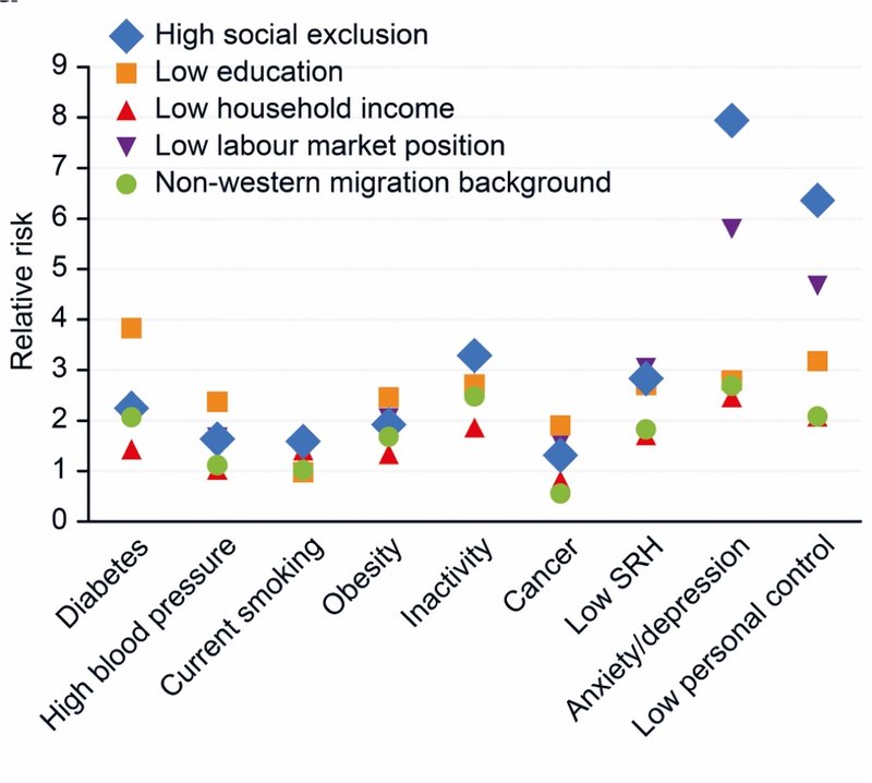 Sociale uitsluiting bleek significant beter in het identificeren van een bevolkingssegment met hoge angst- en depressieklachten en lage regie over het eigen leven dan de vier hierboven genoemde traditionele stratifiers en vergelijkbaar in het identificeren van andere gezondheidsproblemen. De blauwe ruitjes in figuur 1 zijn de relatieve risico’s voor bepaalde gezondheidsproblemen bij volwassenen die wél versus niet sociaal uitgesloten zijn. De figuur laat zien dat sociaal uitgesloten volwassenen bijna 8 keer meer kans hebben om angst- en depressieklachten te ervaren en 6.4 keer meer kans op een lage regie over het eigen leven.