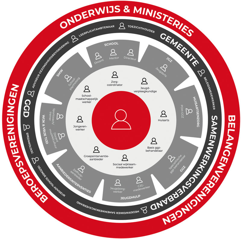 Figuur 1 Het professionele hulpverleningsnetwerk. Bron: Leidraad suïcidepreventie bij Jongeren, Samen Minder Suïcide 15