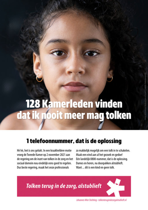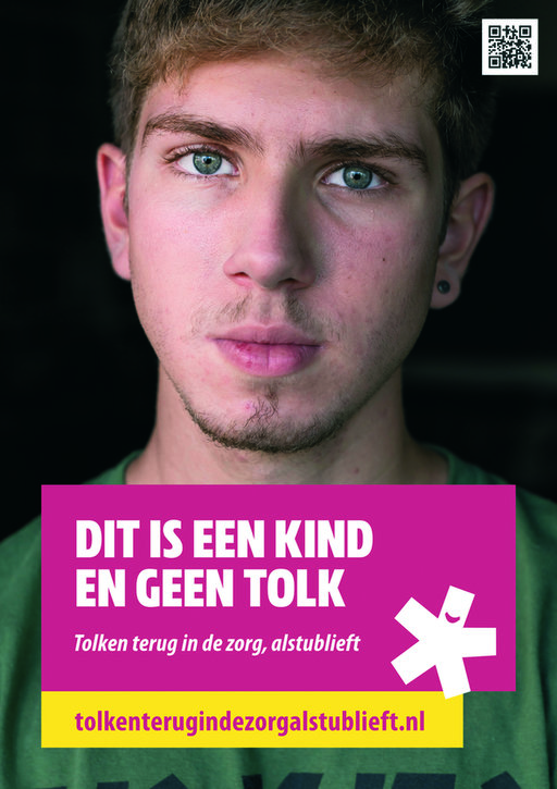 Kinderen die als tolk fungeren in gesprekken met zorgverleners. In Nederland komt dat dagelijks voor. ‘Elke keer als ik zo’n verhaal hoor, gaat me dat aan het hart’, zegt epidemioloog Simone Goosen. ‘Want het veroorzaakt enorm veel stress bij die kinderen, wat nog jaren kan doorwerken. Terwijl dat helemaal niet nodig is, als de zorgverlener een professionele tolk zou inzetten. Daarom besloot ik een paar jaar geleden om alles op alles te zetten voor de terugkeer van de tolk in de zorg.’ Op 10 december 2019 startte Goosen daarvoor de campagne Tolken terug in de zorg, alstublieft. Dat deed ze samen met jeugdarts Petra de Jong vanuit de Johannes Wier Stichting voor gezondheidszorg en mensenrechten. Onderdeel van de campagne is de posteractie Dit is een kind en geen tolk.
