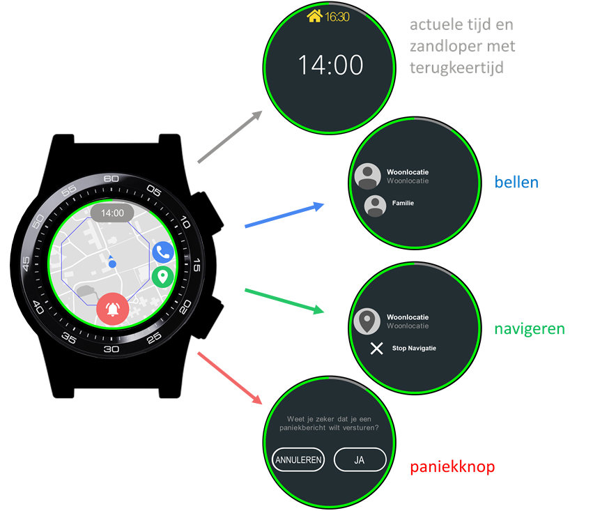 De zorgverlener stelt samen met de cliënt de terugkeertijd in en het gebied waarbinnen de cliënt zich kan begeven. De zorgverlener ontvangt een alarmmelding als de cliënt niet op de afgesproken tijd terug is, zich buiten het afgesproken gebied begeeft, de paniekknop gebruikt of bij een polsalarm.