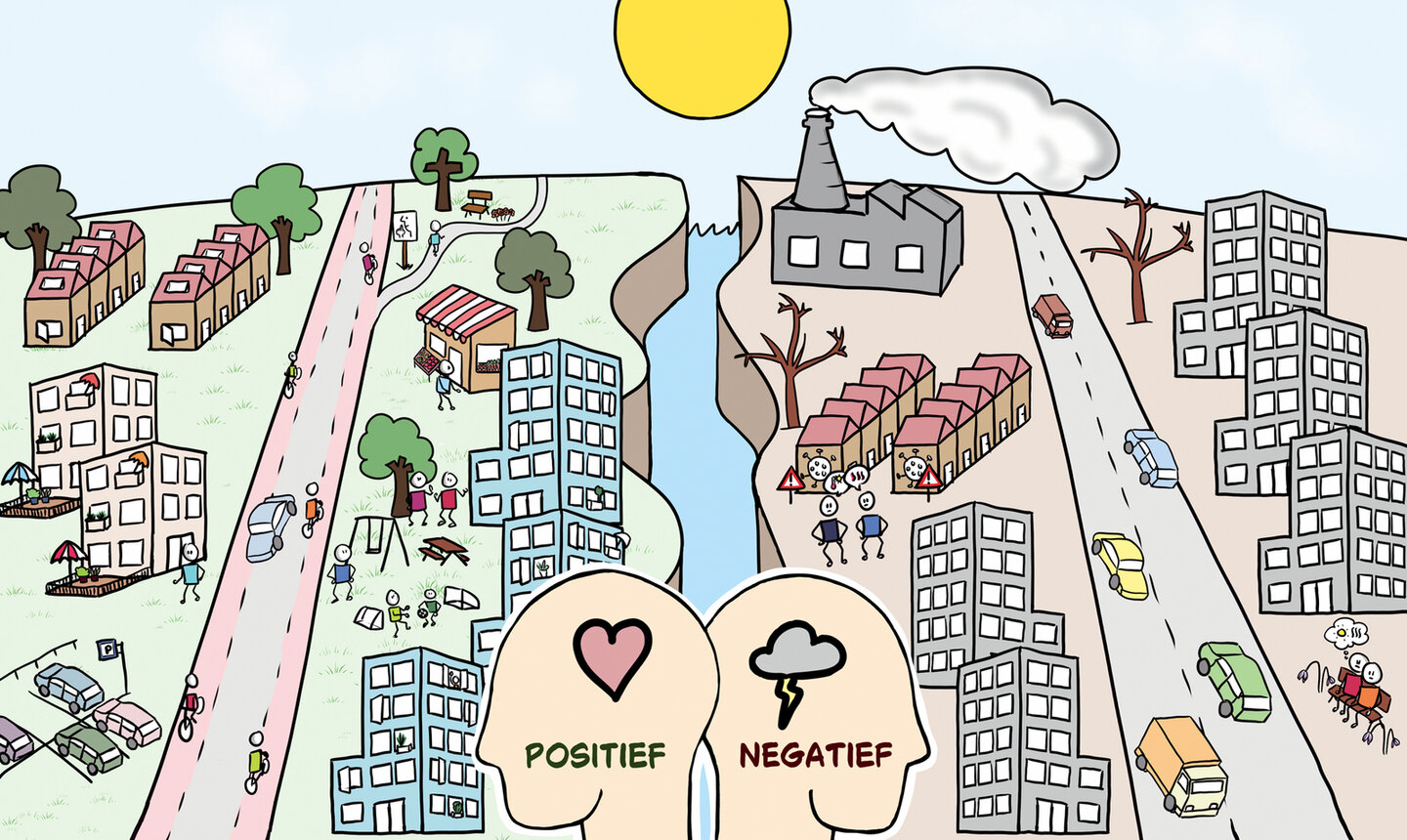 Positieve en negatieve invloeden fysieke leefomgeving op mentale gezondheid (illustratie: Willemieke Ligtenberg)